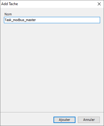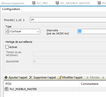 Nous allons paramétrer ces tâches pour qu'elles évoluent toutes les 25ms avec une priorité de 14 (voir le tableau des priorités de tâches dans l'article suivant) et qu'elles appellent nos programmes PLC_MODBUS_MASTER et PLC_MODBUS_SLAVE.