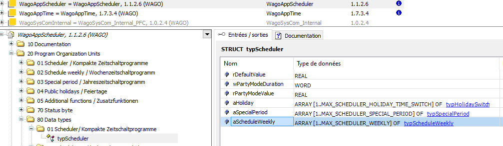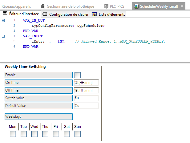 PROGRAM PLC_PRGVAR ofbscheduler:WagoAppScheduler.FbScheduler; xEnable: BOOL; dtActualDateTime: DATE_AND_TIME; typConfigParameters: WagoAppScheduler.typScheduler;END_VAR