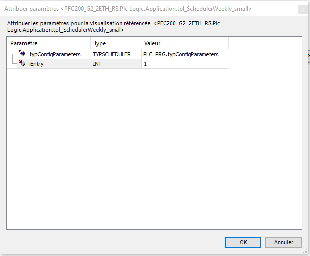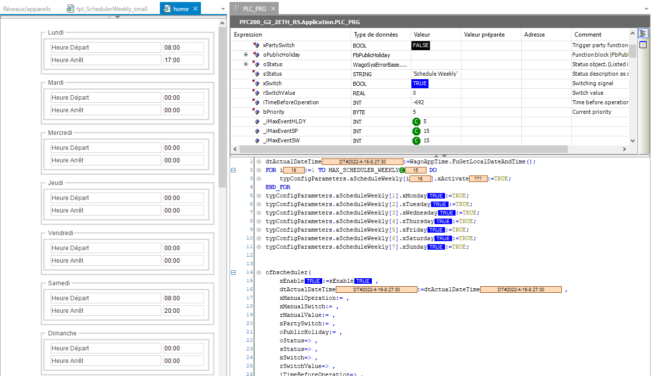 PROGRAM PLC_PRGVAR ofbscheduler:WagoAppScheduler.FbScheduler; xEnable: BOOL; dtActualDateTime: DATE_AND_TIME; typConfigParameters: WagoAppScheduler.typScheduler; i:int;END_VAR