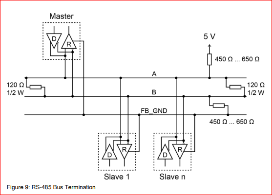 Attention toutefois, une liaison RS485 doit être polarisée, c'est à dire qu'elle doit avoir un niveau de référence par rapport au 5V et un niveau de référence par rapport au 0V. Cette polarisation permet d'éviter d'avoir des messages parasites dus aux fluctuations de niveaux de tensions lorsqu'aucun équipement n'émet d'information.